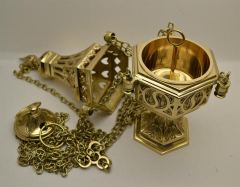 Traditional European Style Gothic Thurible with removable charcoal cup. Polished Brass or Silver Plated.